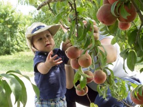 After visiting the play areas and enjoying a delicious breakfast of peach pancakes, we visited the peach orchard. Now, I went in to that orchard with the intention of only picking a few peaches, a pound or two, to make a peach crisp for dessert that night. However, the only options for containers were big bushel boxes, so who was I to not fill that thing up?! Once we got to the orchard, the trees were just bursting with peaches! I easily filled the box in just a few minutes, even with Oliver getting in on the harvesting action.