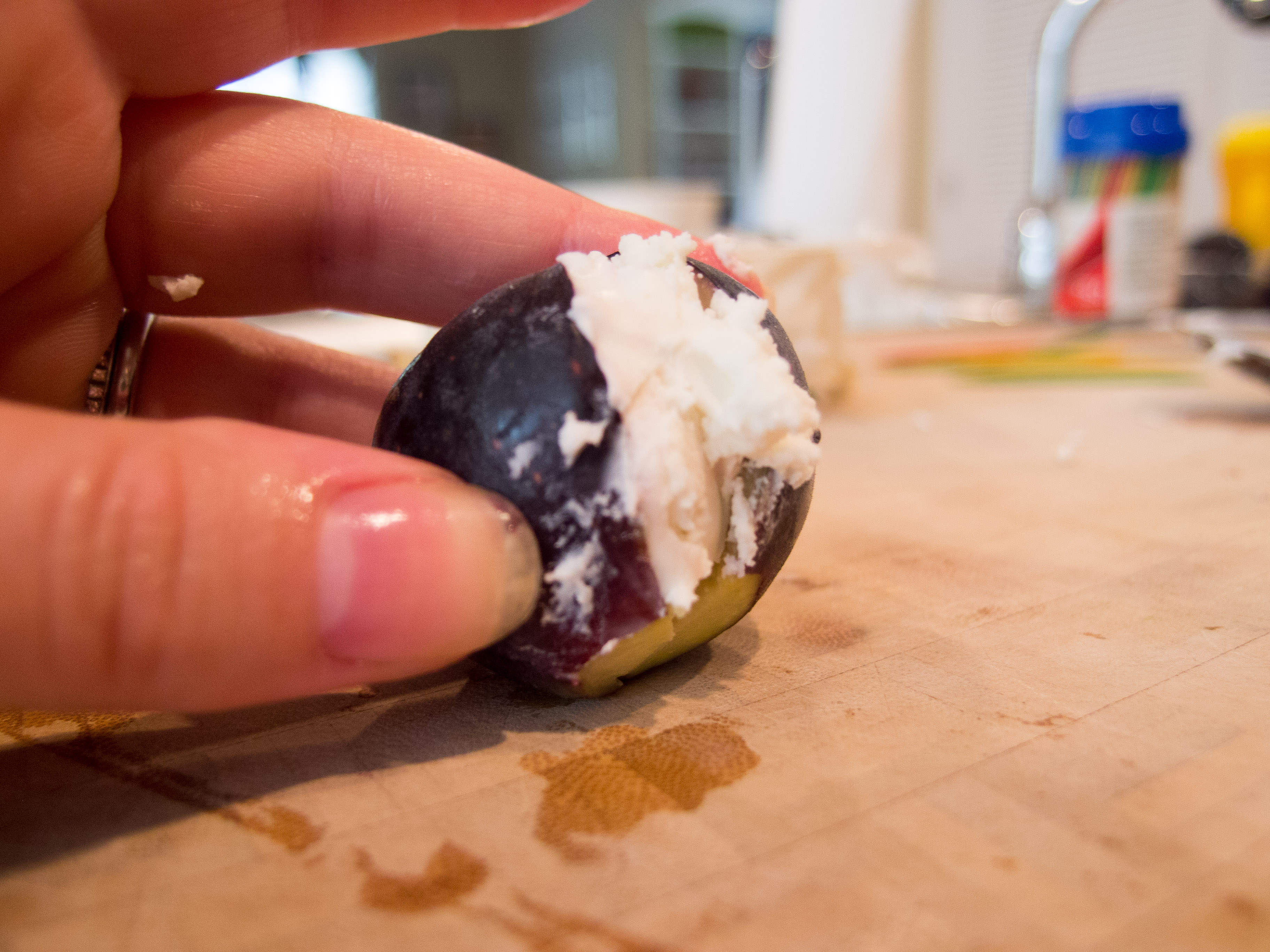 Cut the top stem off the fig and make an inch vertical cut on the fig, being careful only cut about halfway through the fig.