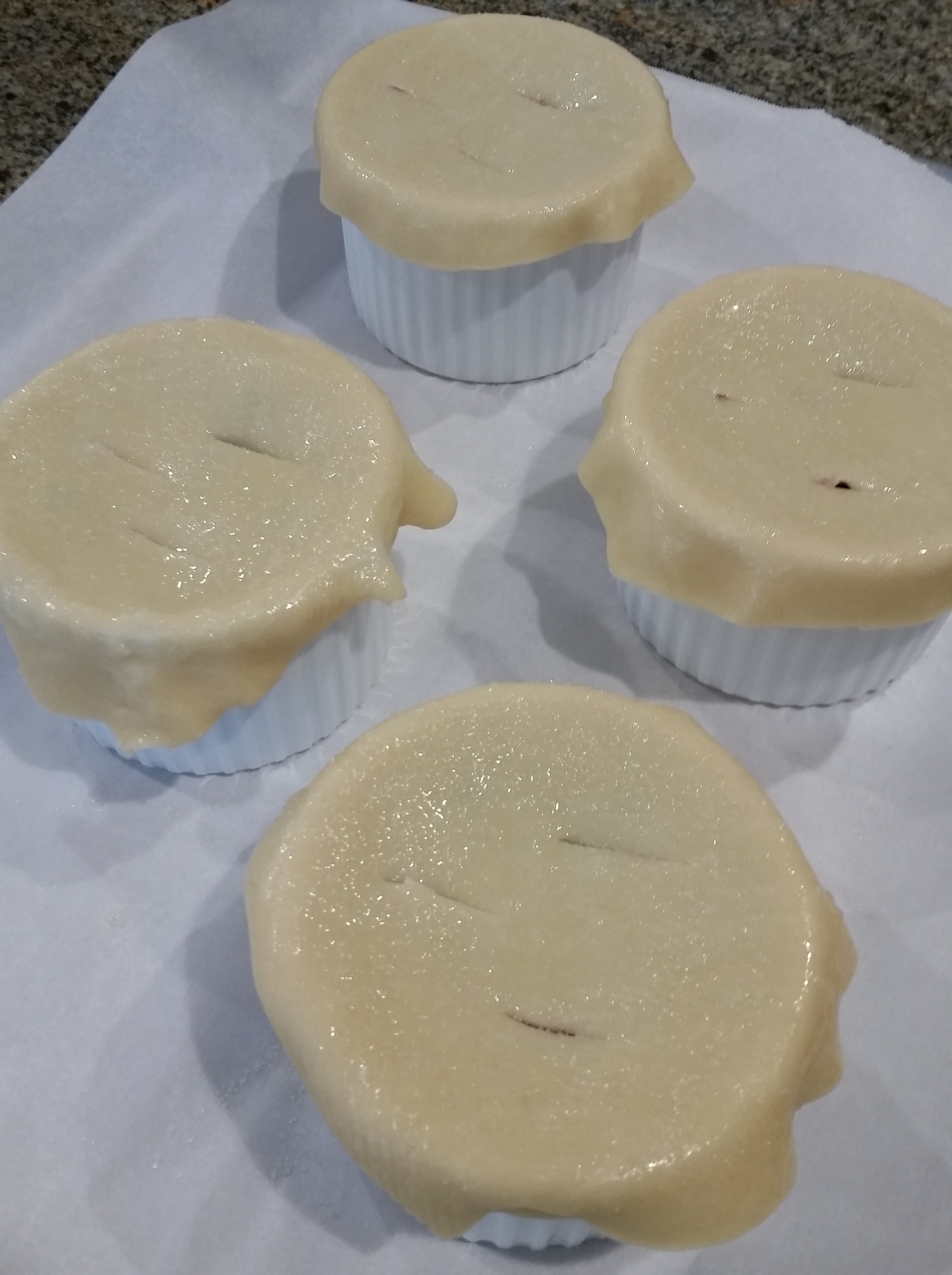 Add the cut out dough circles to the ramekins and put three slits in each one for steam to escape. Crack the egg in a bowl and whisk it together. Brush the egg wash on the tops and sides of the pie dough and then add a little sprinkling of sugar to each one.