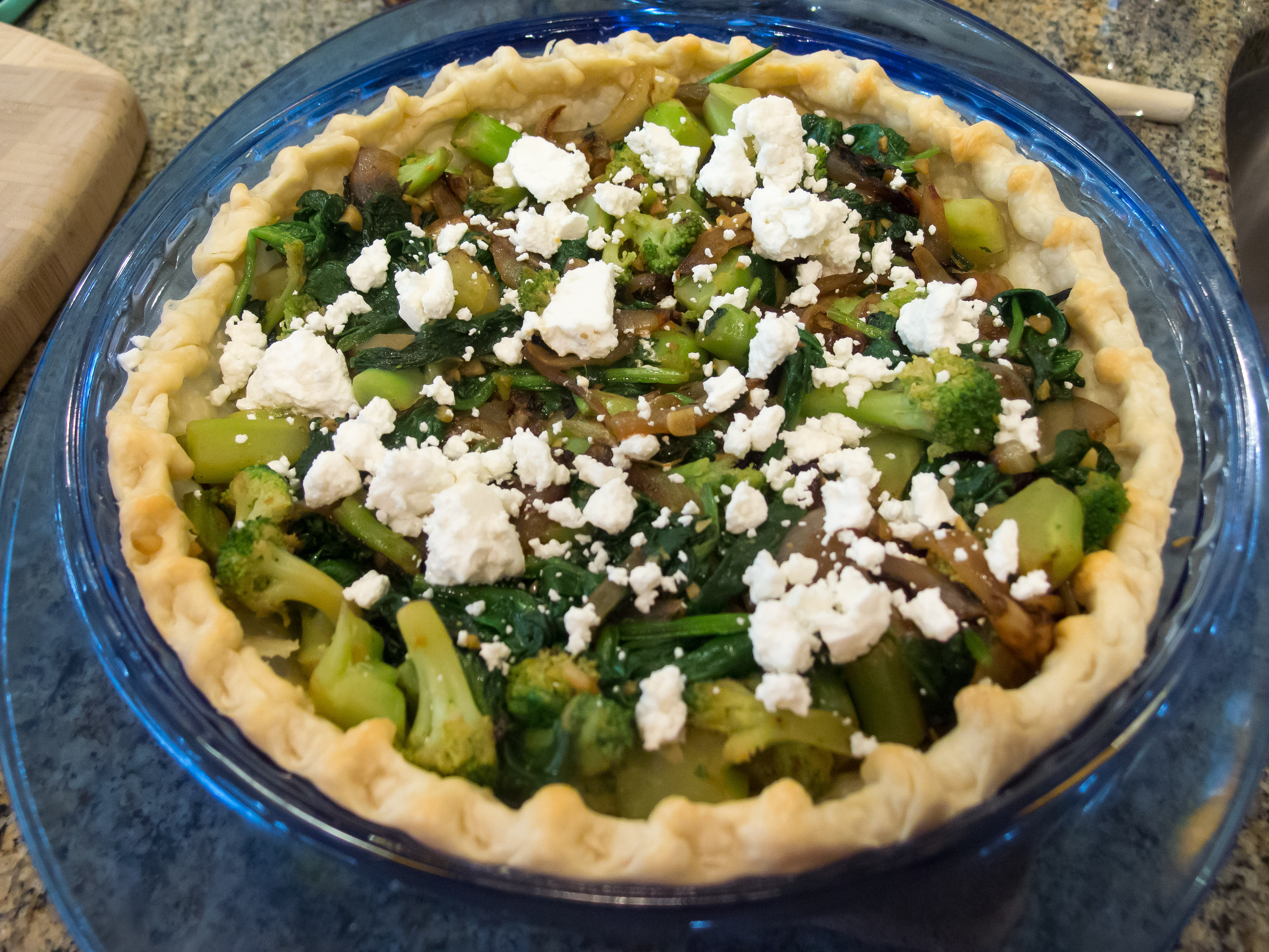 Evenly spread the sauteed veggie mix to the slightly cooled pie crust. Crumble the goat cheese on top of the veggies.