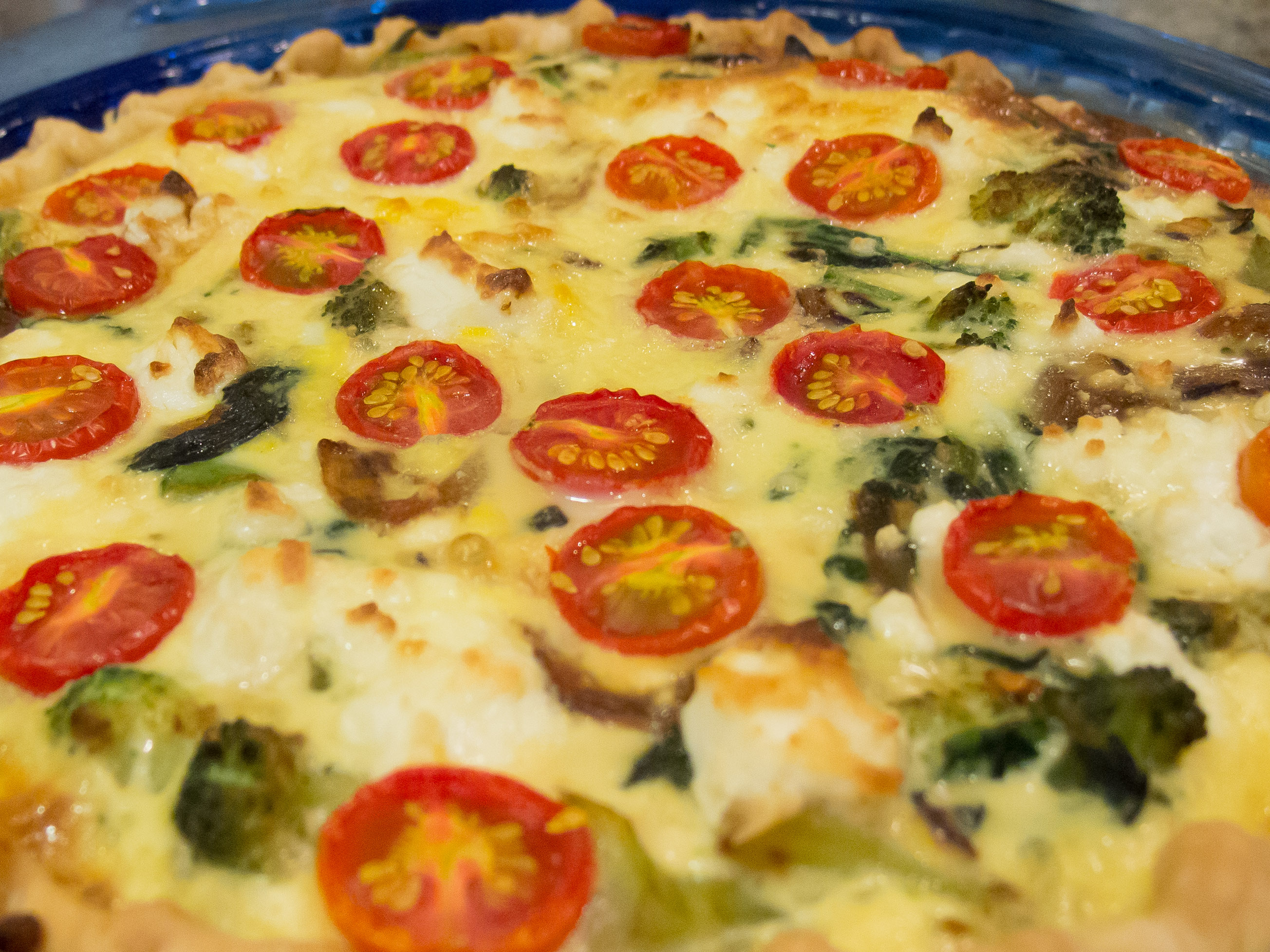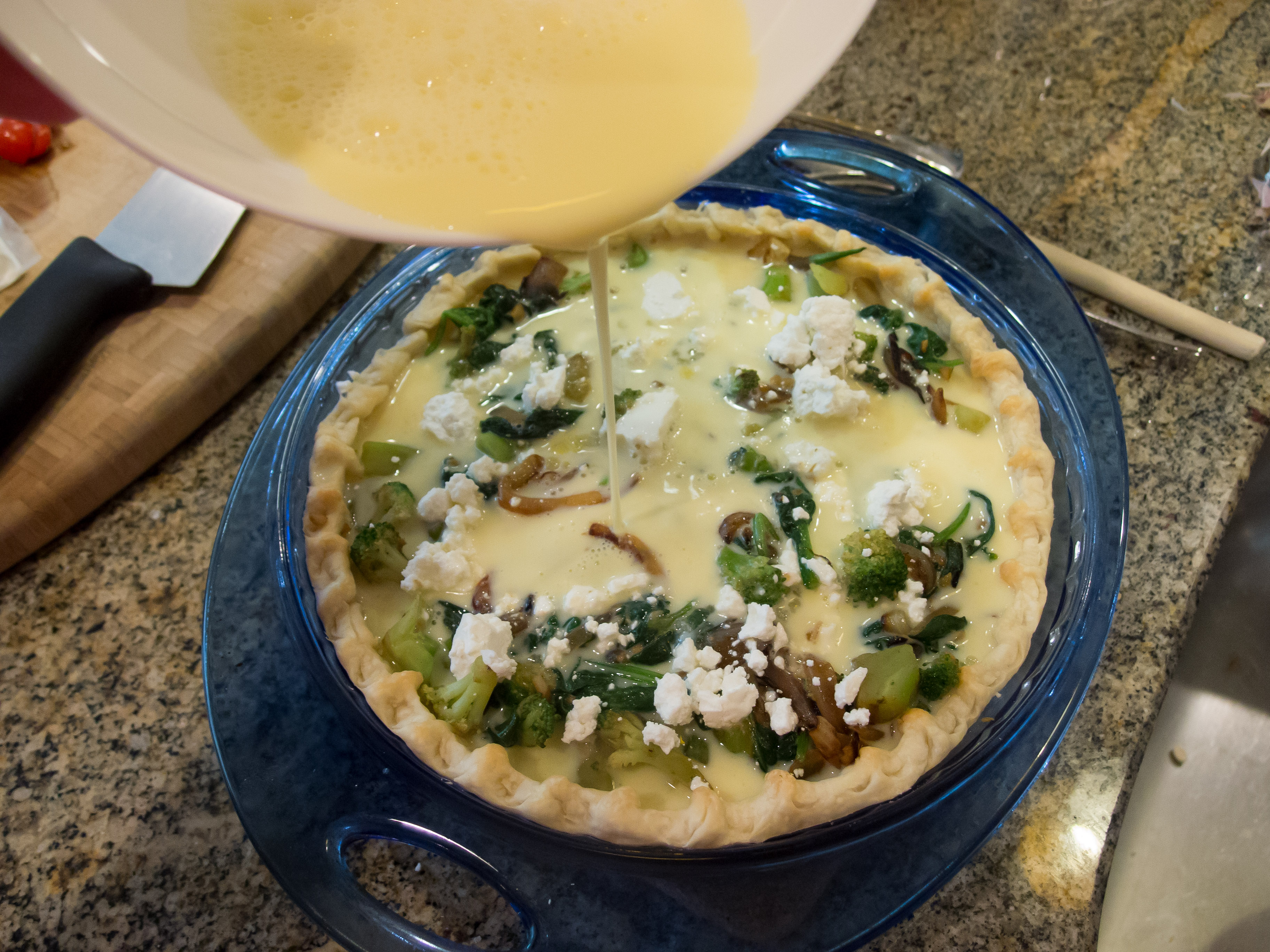 Lately I’ve been trying to eat down the massive amount of food we seem to have in our house, mostly focusing on the pantry. However, our fridge and freezer seemed awfully full for a family of three so I was looking for a way to use up some existing items, such as a single pie crust, frozen broccoli, goat cheese and eggs. A quiche naturally came to mind. Normally, Toby would protest a dinner without some form of meat, but since we are both trying to eat a little healthier these days, he was pretty game for a vegetarian meal. Quiche is very adaptable to using whatever you have on hand so feel free to use this as a base to experiment with different veggies (kale, chard, zucchini, red peppers, etc) and cheeses (comte, gruyere, cheddar).