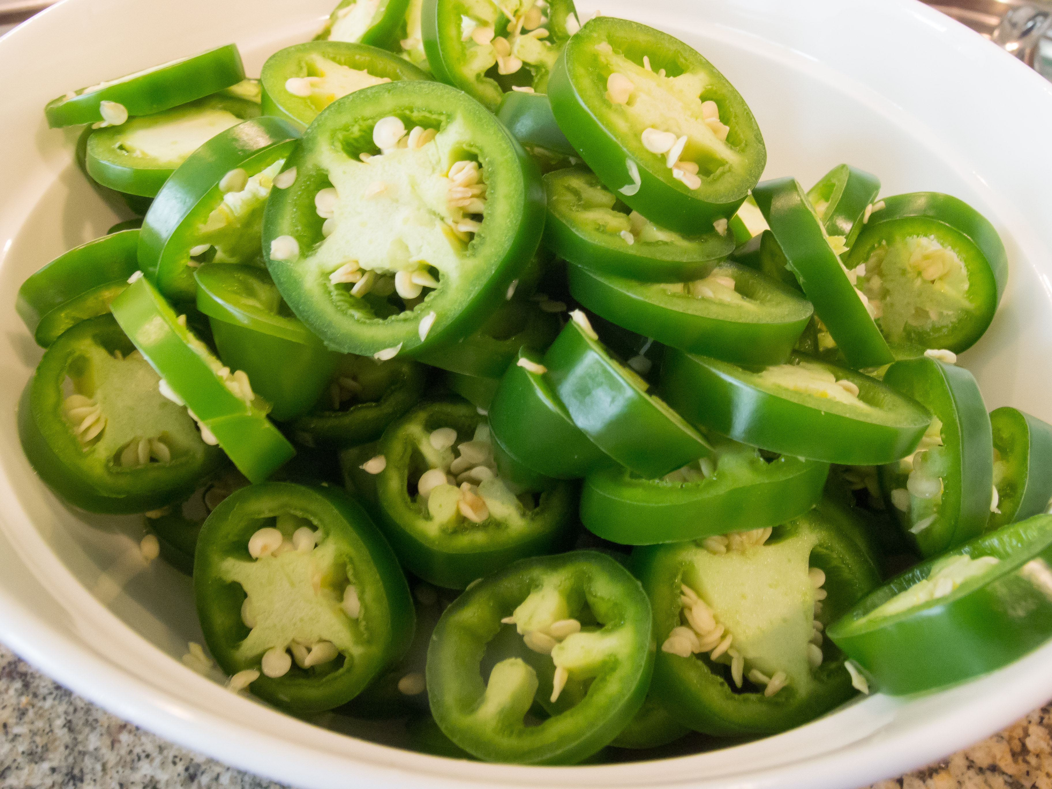 Remove the jars from the water bath and add the jalapeno slices, packing them in the jars as tightly as possible.