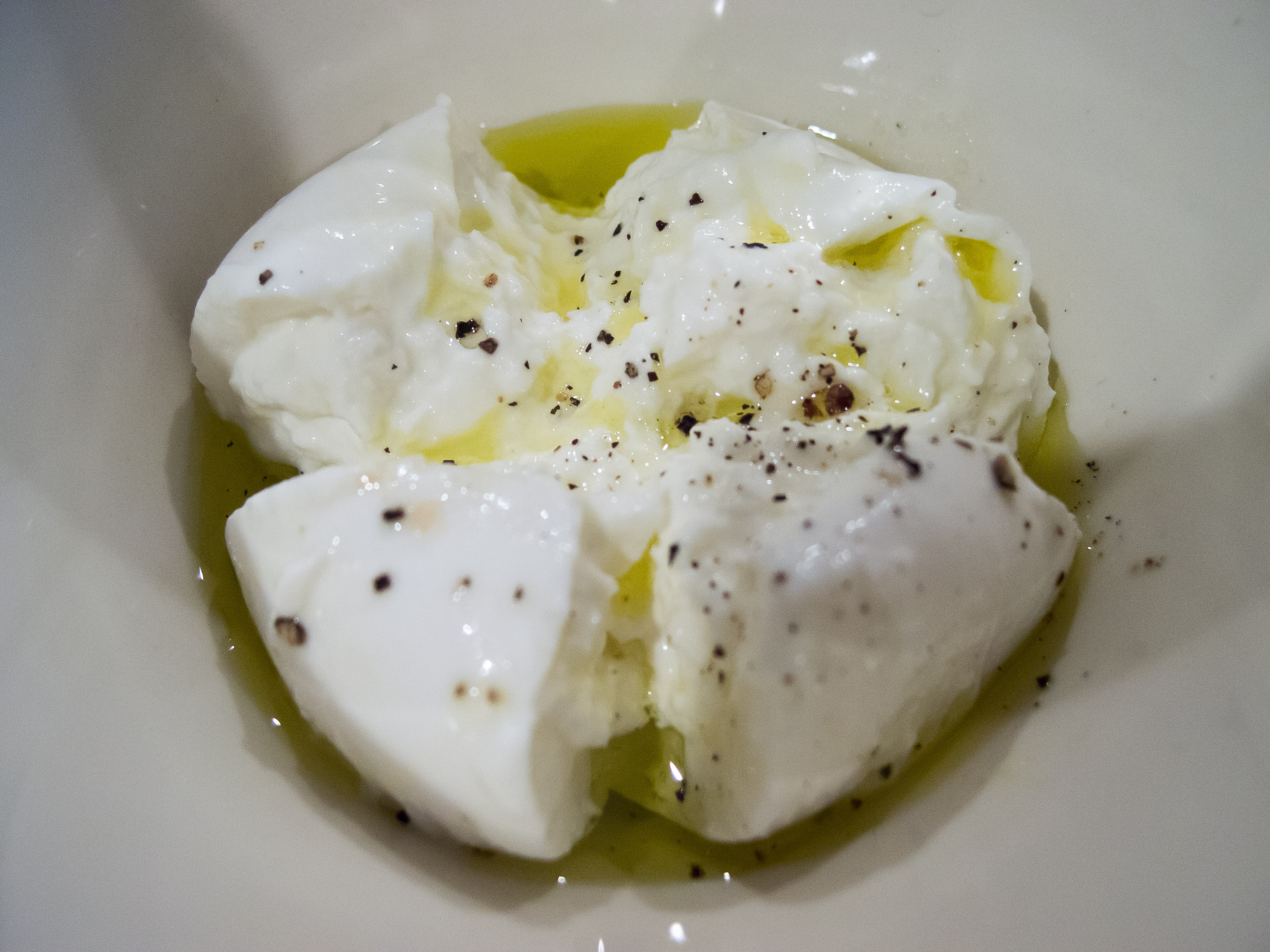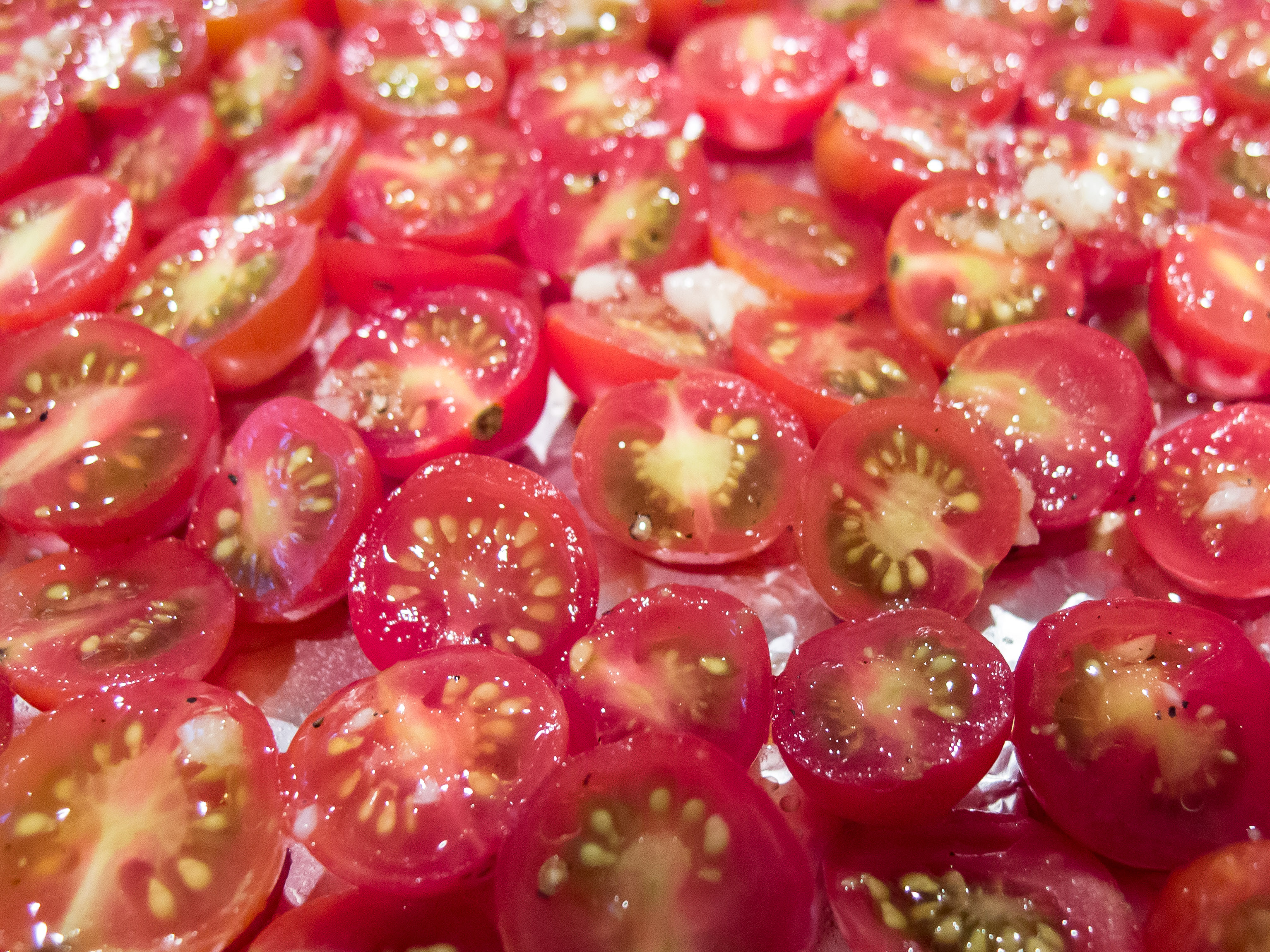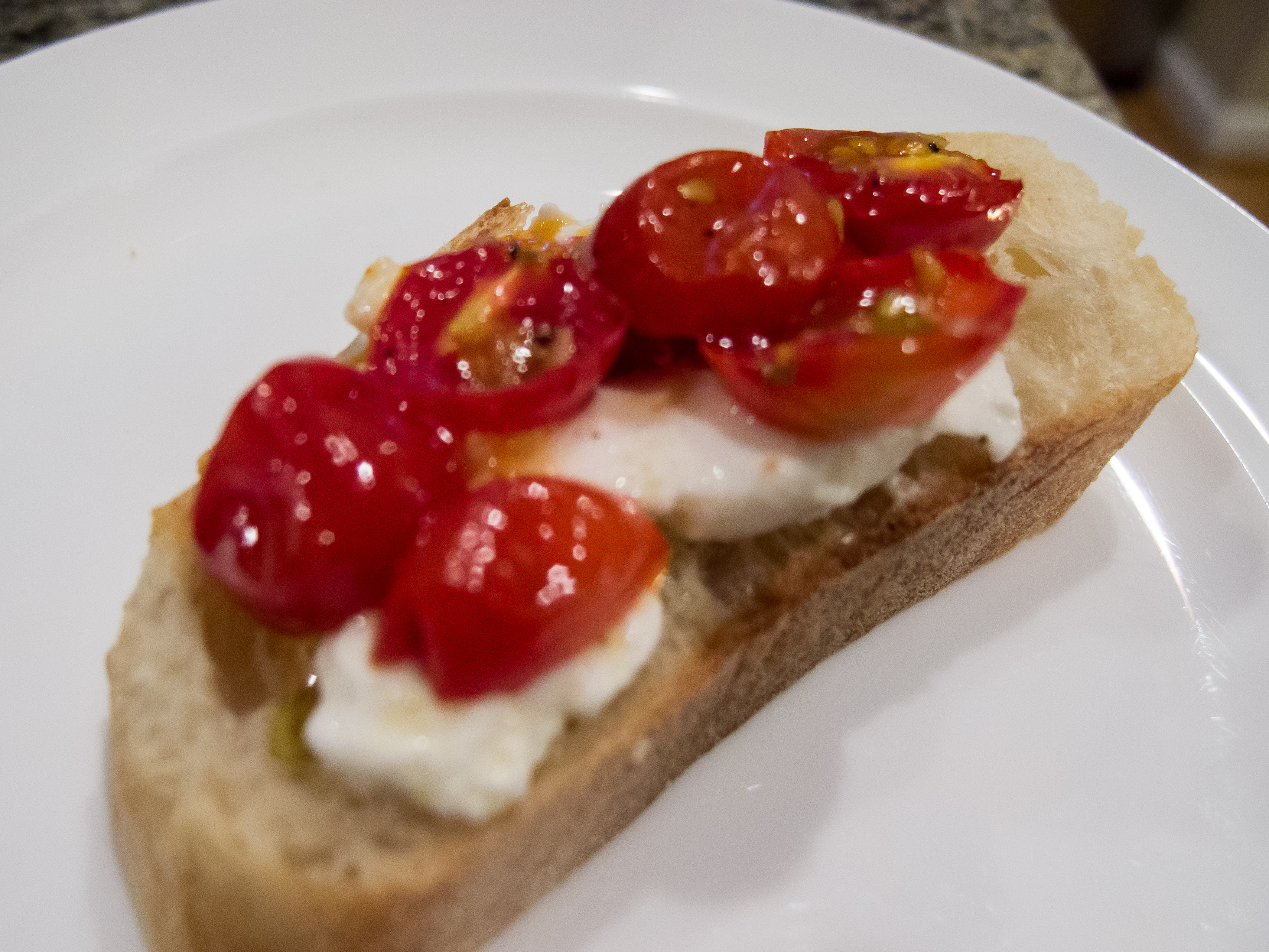 The appetizer selection for this dinner was based on whichever one I could find that used up the most cherry tomatoes, which are currently overflowing from the garden. I found a honey roasted cherry tomato recipe that was perfect, and I served it with some creamy burrata cheese and baguette slices. The perfect way to kick off a mid-summer meal with friends.