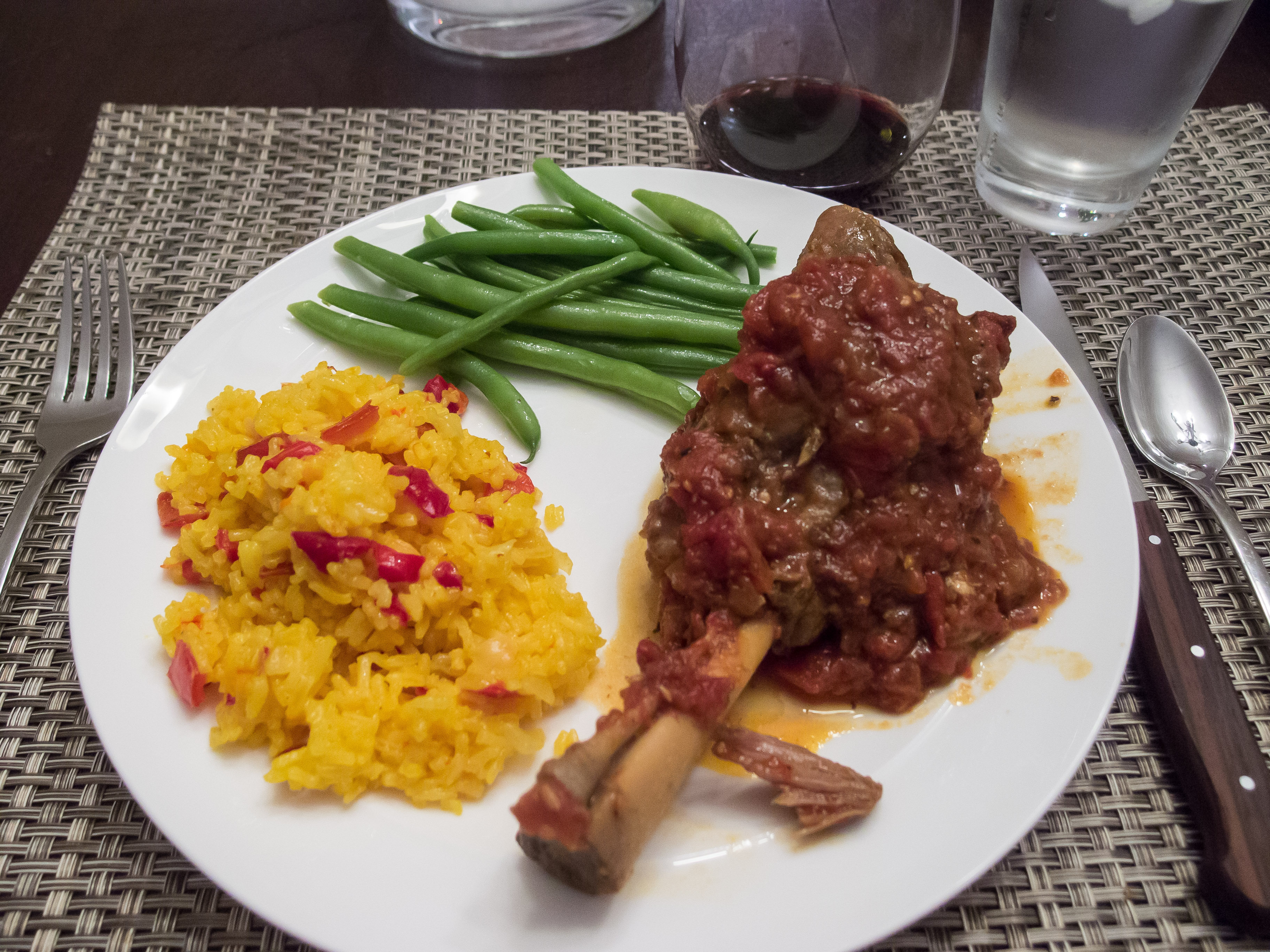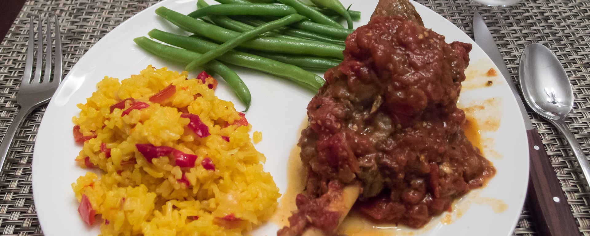 Menu – Braised Lamb, Saffron Rice, Lemony Green Beans, Plum Crumble