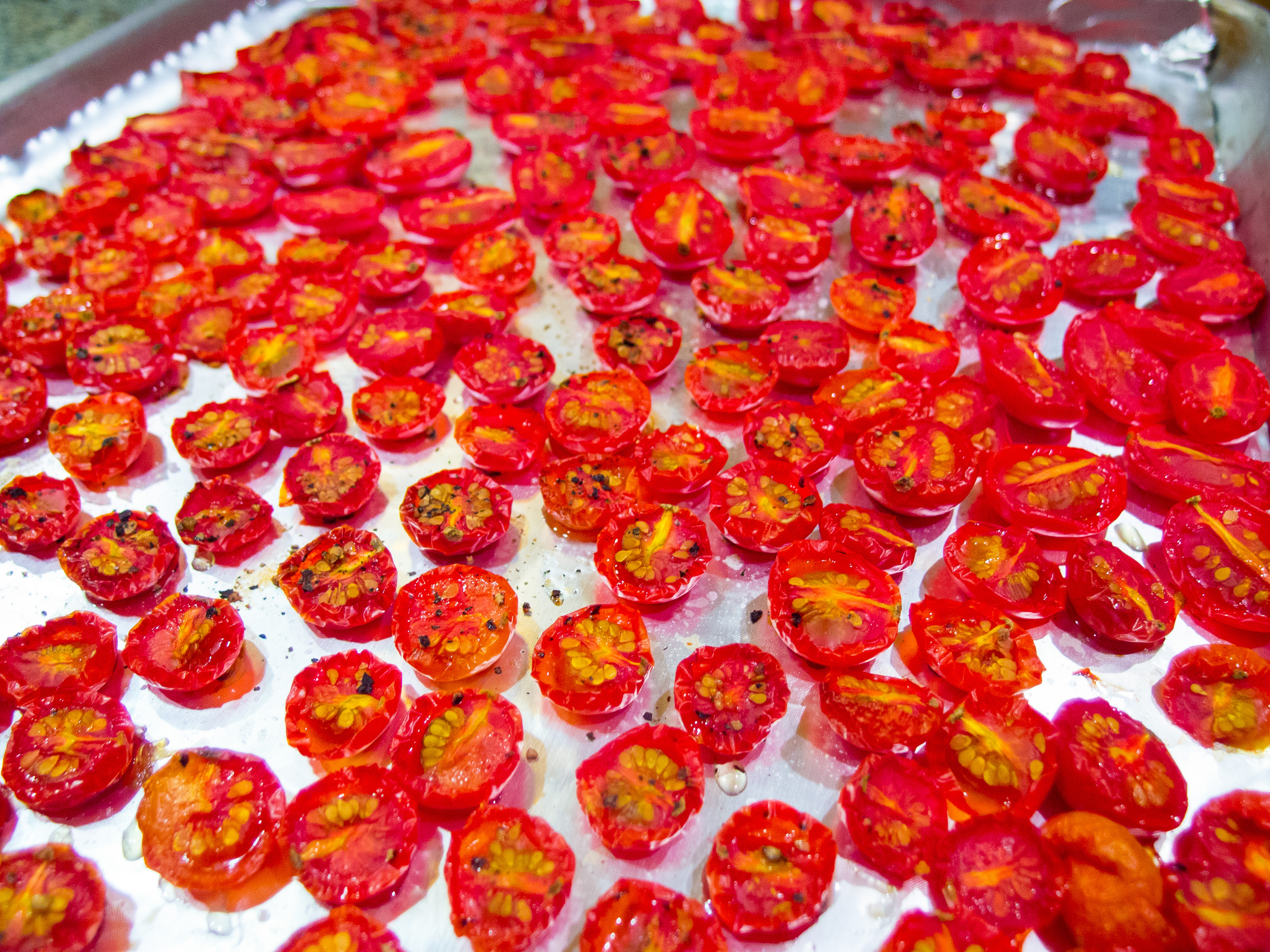 Half the tomatoes and place them on baking sheets close together with the cut side up. Depending on how many tomatoes you have, you may need more than one baking sheet.