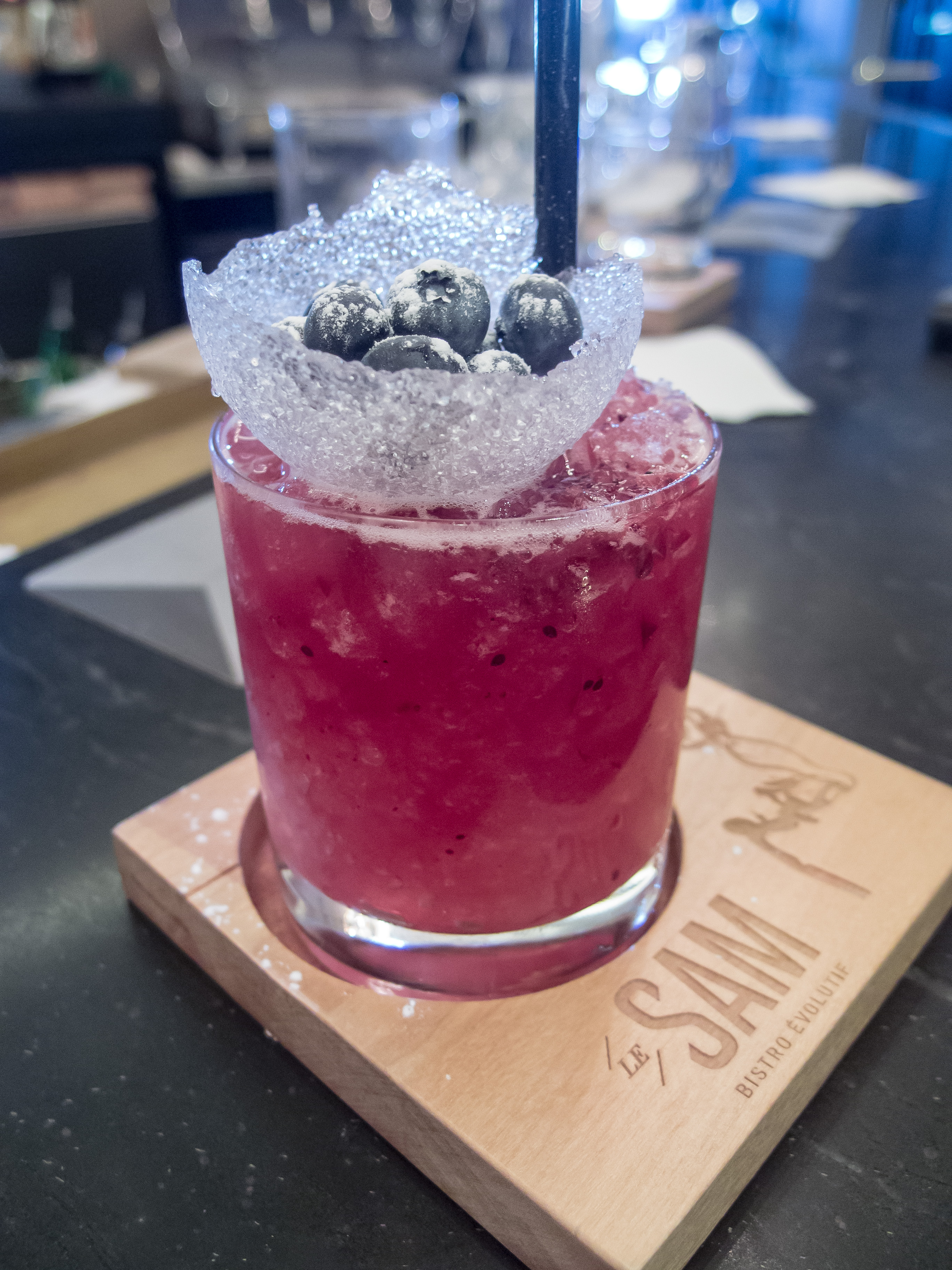 After a walk along the walls surrounding the old city in the morning, we went back to out hotel for some more primping and to check out of our hotel. Since we had a couple hours before our lunch reservation at Le Continential, we decided to check out the bar at the Chateau Frontenac. The hotel is stunningly beautiful with gorgeous bars. We made fast friends with the bartender, Sebastian, and had some really cool craft cocktails. I’m kind of a sucker for any cocktail made with jam, so I was immediately drawn to the vodka cocktail with a cranberry and pink peppercorn jam and lime juice – which was amazing. I love watching bartenders make specialty drinks, especially when they add creative touches to make the drink spectacular. As he was filling the glass with crushed ice, he added some to a lemon squeezer and crushed it again. He set that aside while he made the drink and then opened up the lemon squeezer to reveal a perfectly formed ice bowl, to which he added blueberries and topped the drink as a garnish. It was an awesome new trick to add to our cocktail skills!