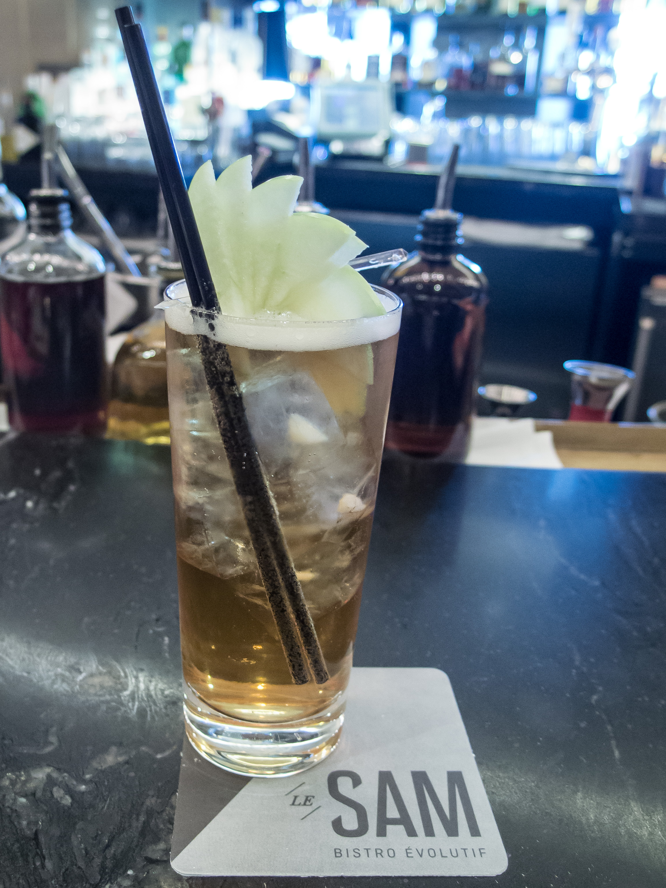 After we finished our first drinks, we asked Sebastian to create another drink for us to share and he made a cocktail using a house made apple shrub. Shrubs are vinegar-based fruit syrups and previously I’ve come across shrub recipes in preserving books, but have not yet made any, so this inspired me to try out some of those recipes. Sebastian made the cocktail with the apple shrub, ginger ale and El Dorado rum. We both loved the drink.