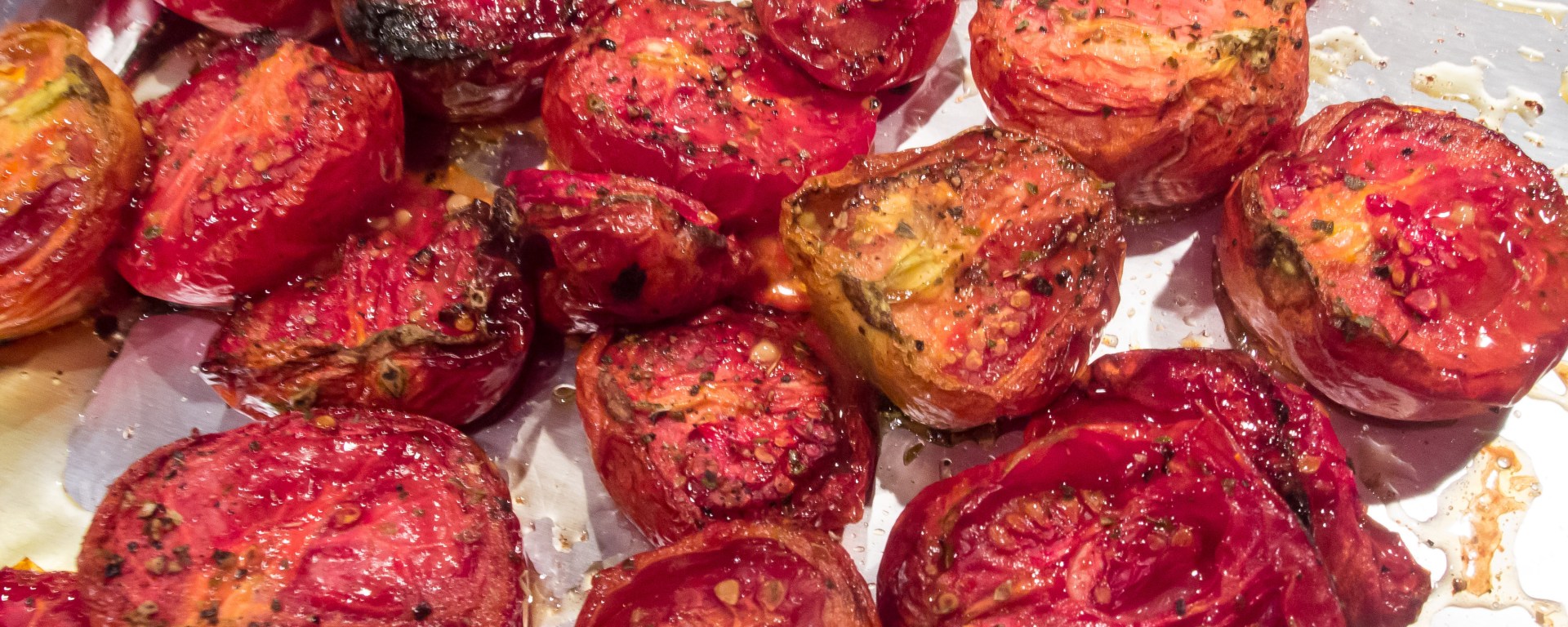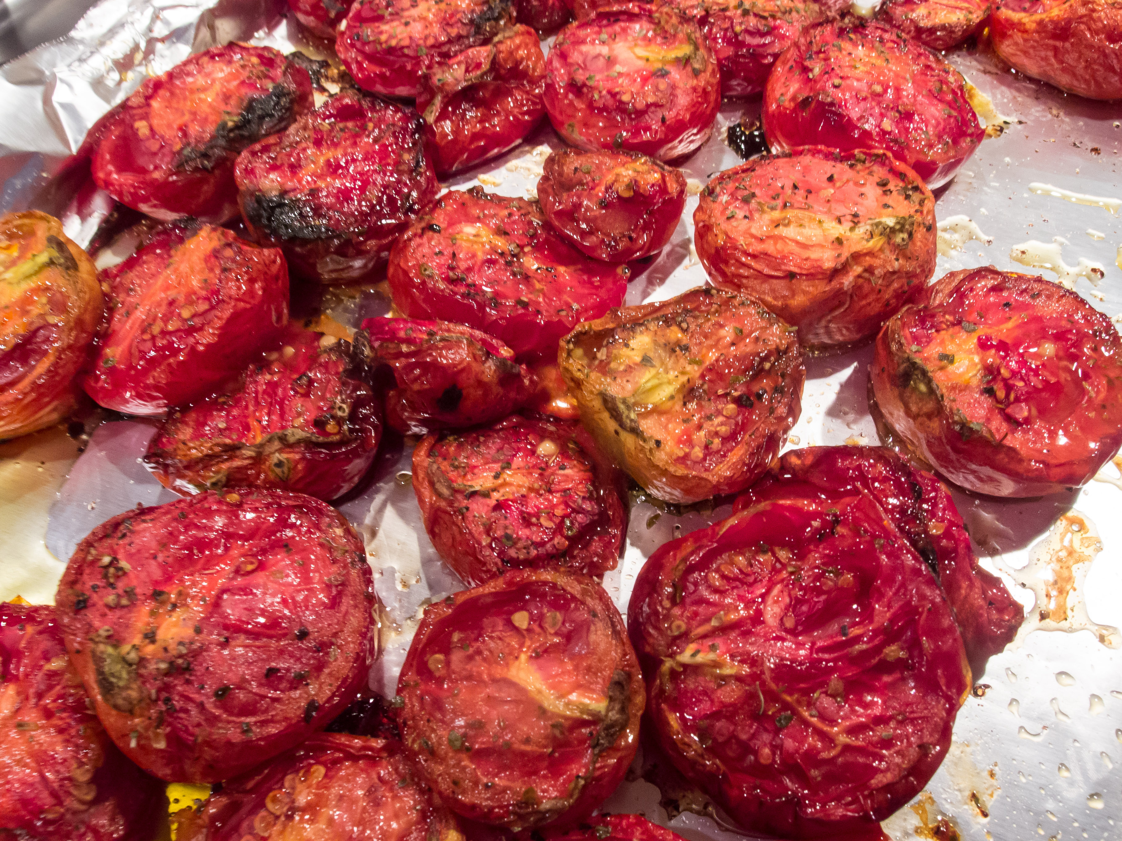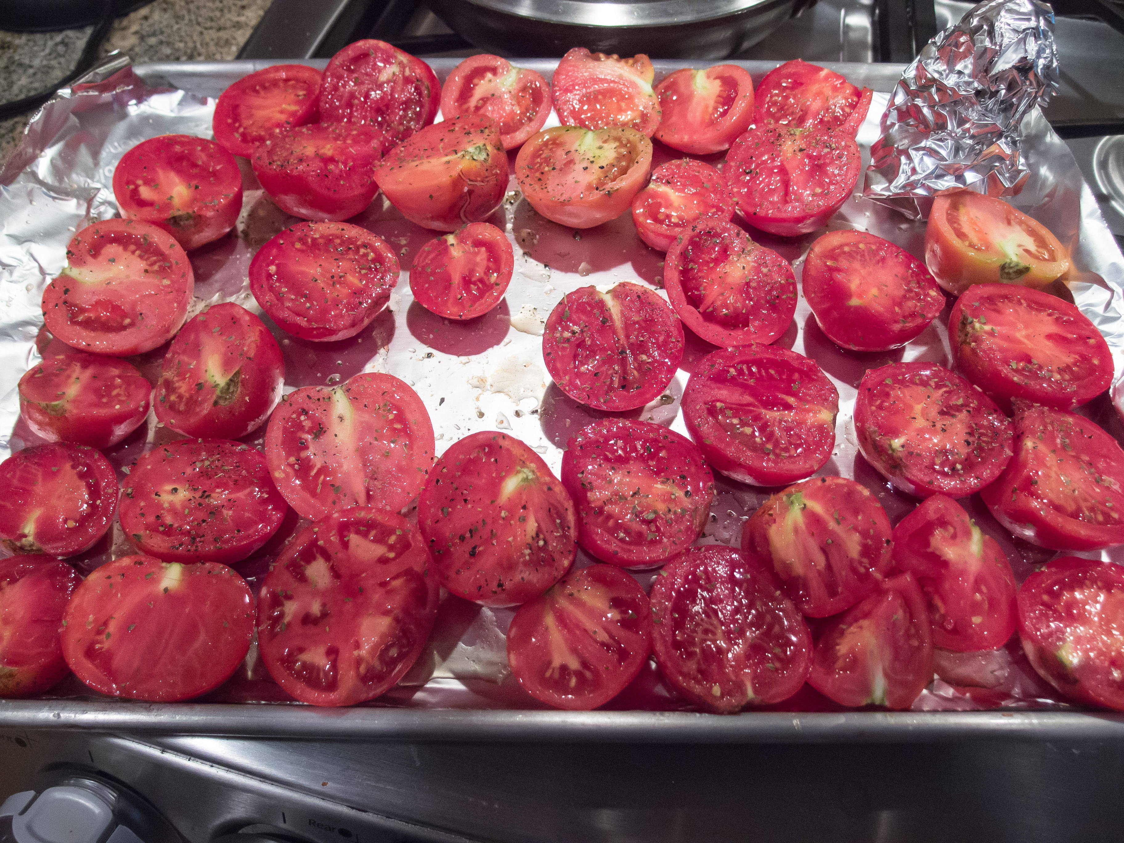 Place cut tomatoes on a baking sheet, drizzle with olive oil and sprinkle oregano and salt over the tomatoes evenly.