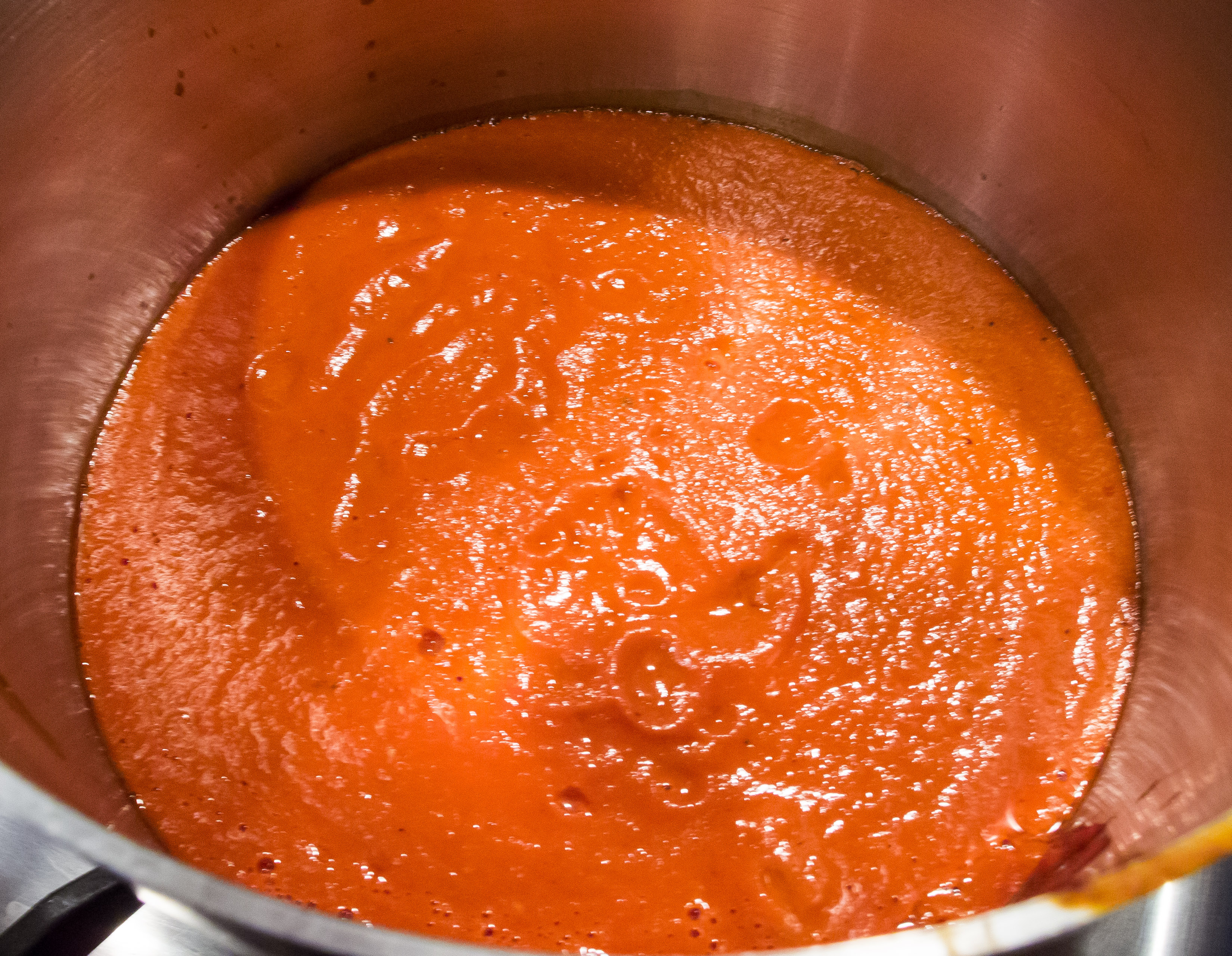 Remove the tomatoes from the oven and carefully transfer the tomatoes and juices to the blender and puree until smooth, about 1-2 minutes.