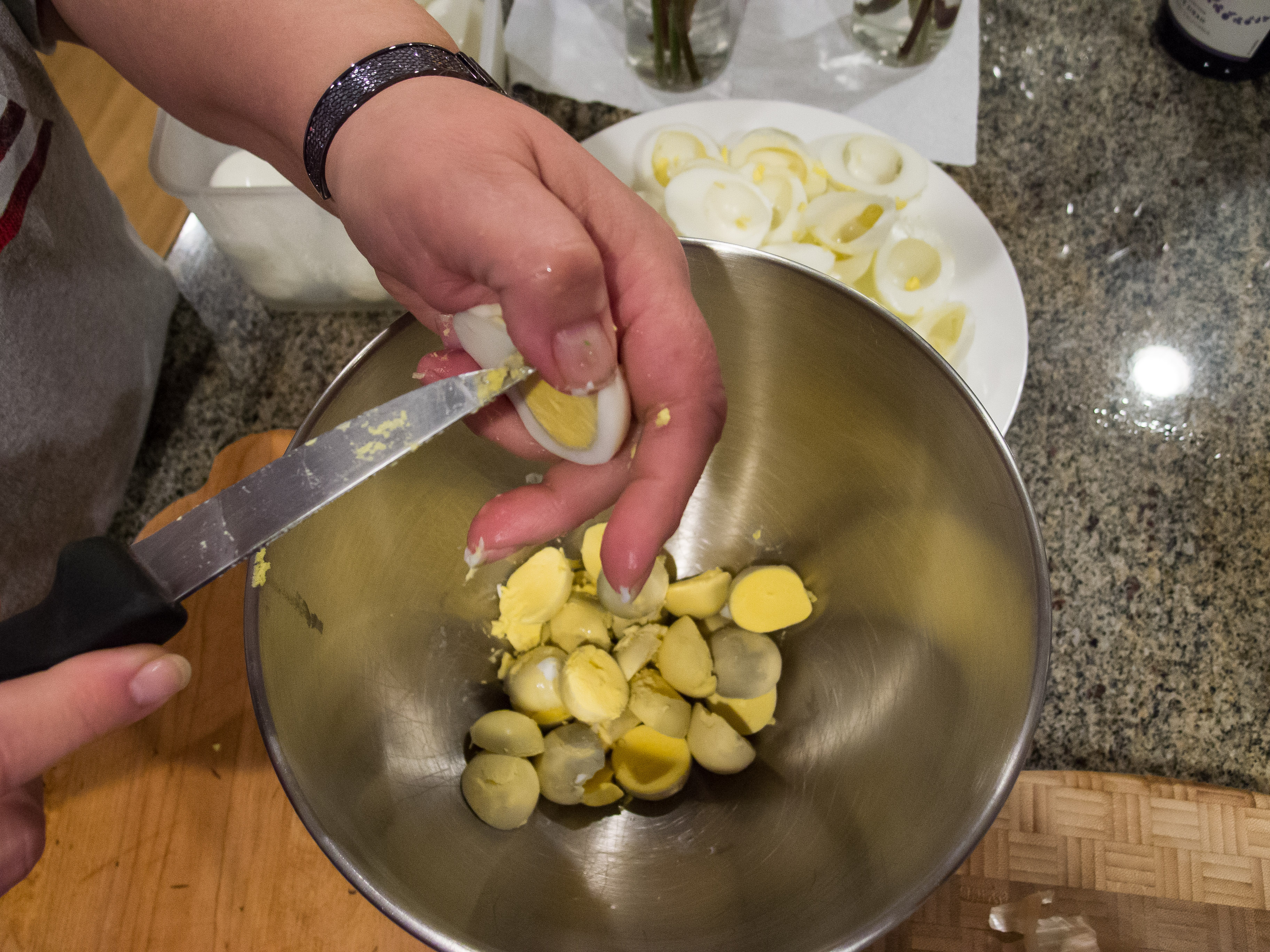 - 36 eggs, boiled, halved and yolk removed