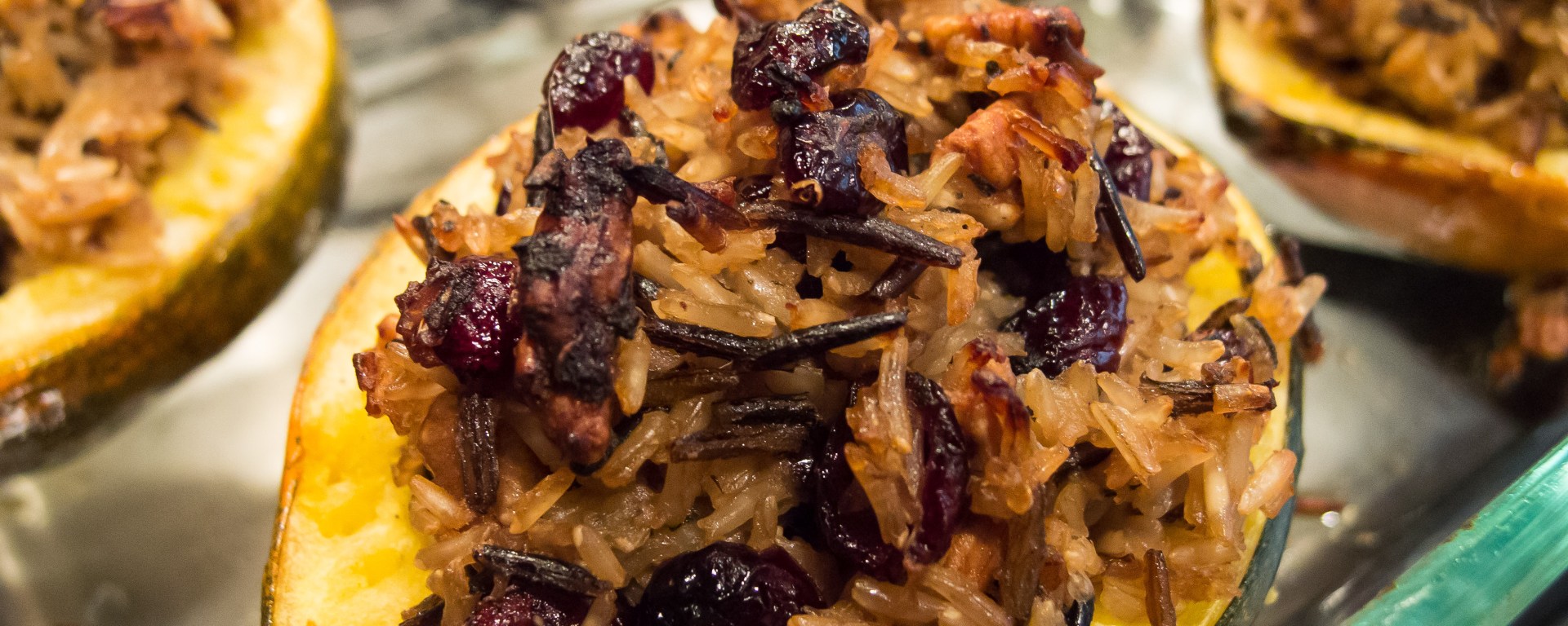 Acorn squash lends itself well to being stuffed, with its little natural cup ready to hold whatever you have in mind to fill it with. I’ve done meaty fillings in the past, especially with ground lamb (very yummy), but I wanted to find a really hearty, meatless version that would go great as a side dish on a holiday table, but could easily work as a healthy main course as well.  I came up with this recipe as all these flavors, from the wild rice to pecans to cranberries, remind me of fall, and are the perfect stuffing to add to this delicious fall squash.