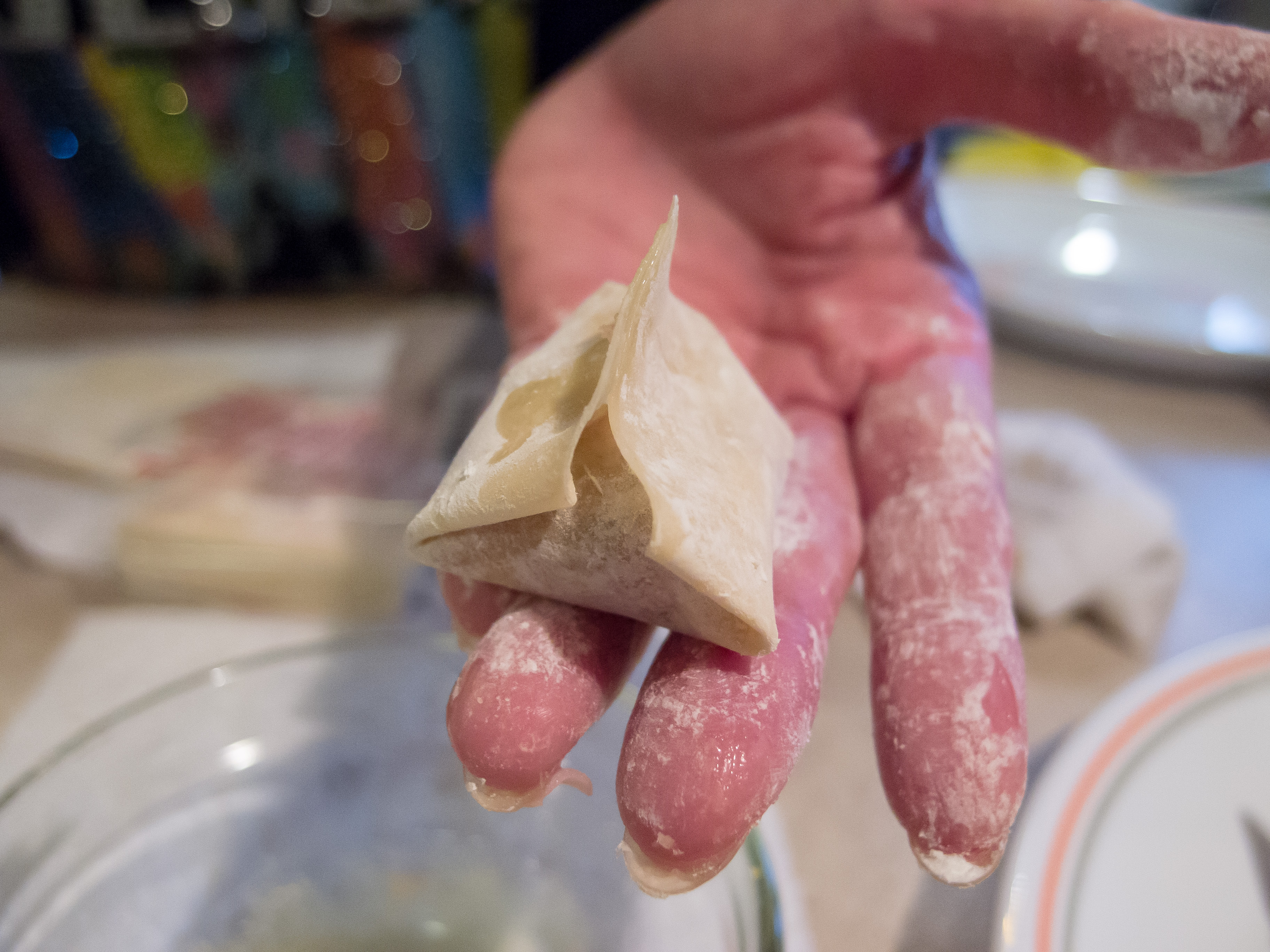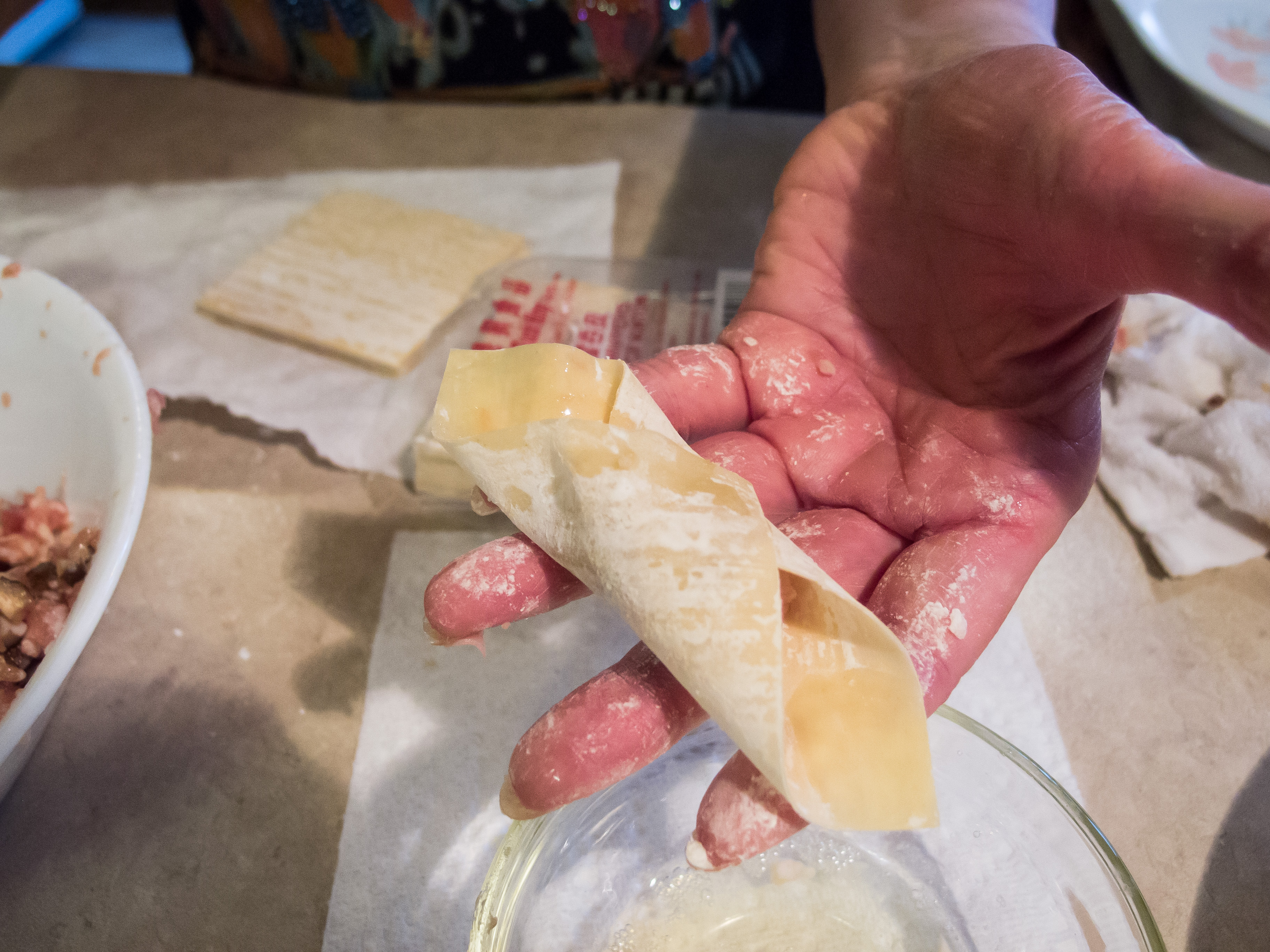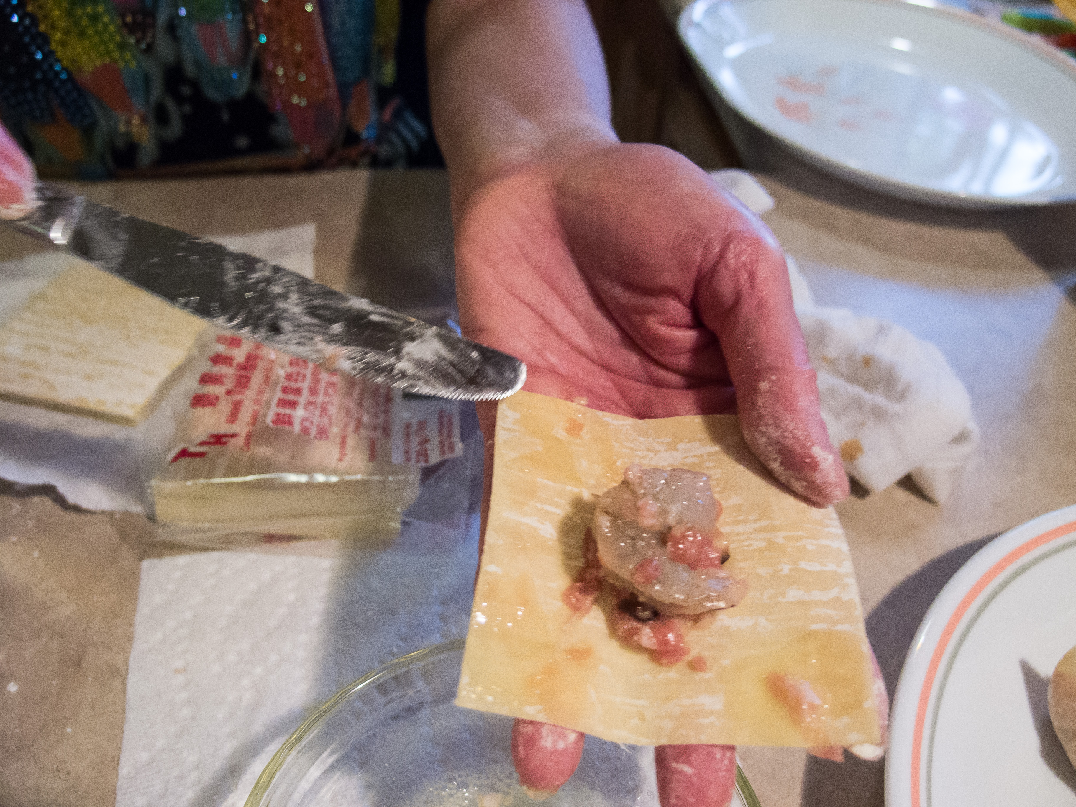 The photos below are from our trip, but when I made these at home, I adjusted the pork/shrimp ratio because I only had a 1/2 pound of ground pork on hand so I increased the amount of shrimp. Also, I’m not a fan of mushrooms and we couldn’t find a small quantity of dried mushrooms locally, so I omitted them from her original recipe. But, if you have a few dried mushrooms on hand, soak them for about an hour, give them a chop and toss them in.