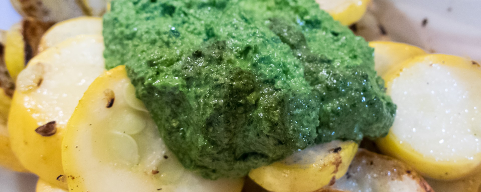 Since I have so much chard, I wanted to try pesto made just from chard leaves so I made a small, experimental batch using ingredients I had on hand and it turned out great! This week, I added this pesto to grilled yellow squash from the garden, to plain veggie pasta and to a tomato meat sauce topping spinach stuffed shells.