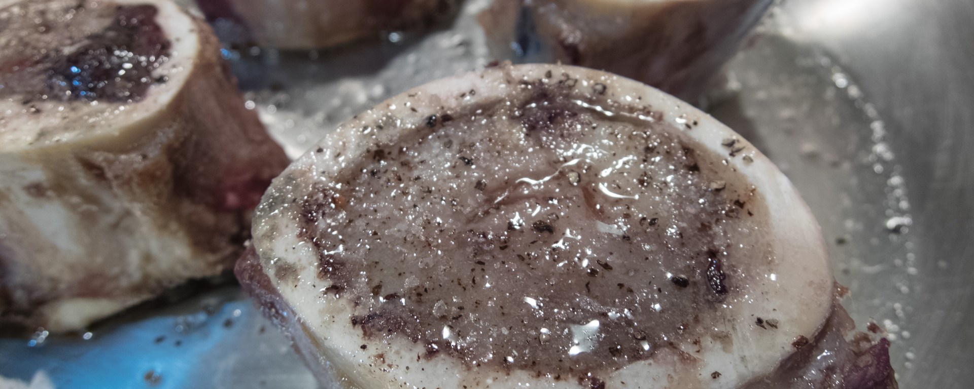 Preheat the oven to 400º. Put the marrow bones cut side up, with the wider side up, on an oven-proof skillet. Sprinkle with salt and pepper to taste.